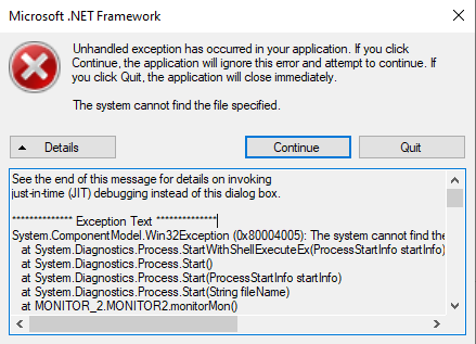First published on MSDN on Aug 20 2013. The specified module could not be found ive been trying to get this to work for hours looking everywhere for help. NET Core Version. O sistema não pode encontrar o arquivo especificado at SystemDiagnosticsProcessStartWithShellExecuteExProcessStartInfo startInfo at SystemDiagnosticsProcessStartProcessStartInfo startInfo at SystemWindowsFormsButtonOnMouseUpMouseEventArgs mevent. Access is denied Win32Exception 0x80004005. Try SystemDiagnosticsProcess myProc gcnew SystemDiagnosticsProcess. Jan 15 2019 0315 PM. 30 Preview1 Windows version. The handle is invalid at SystemDrawingGraphicsCopyFromScreenInt32 sourceX Int32 sourceY Int32 destinationX Int32.